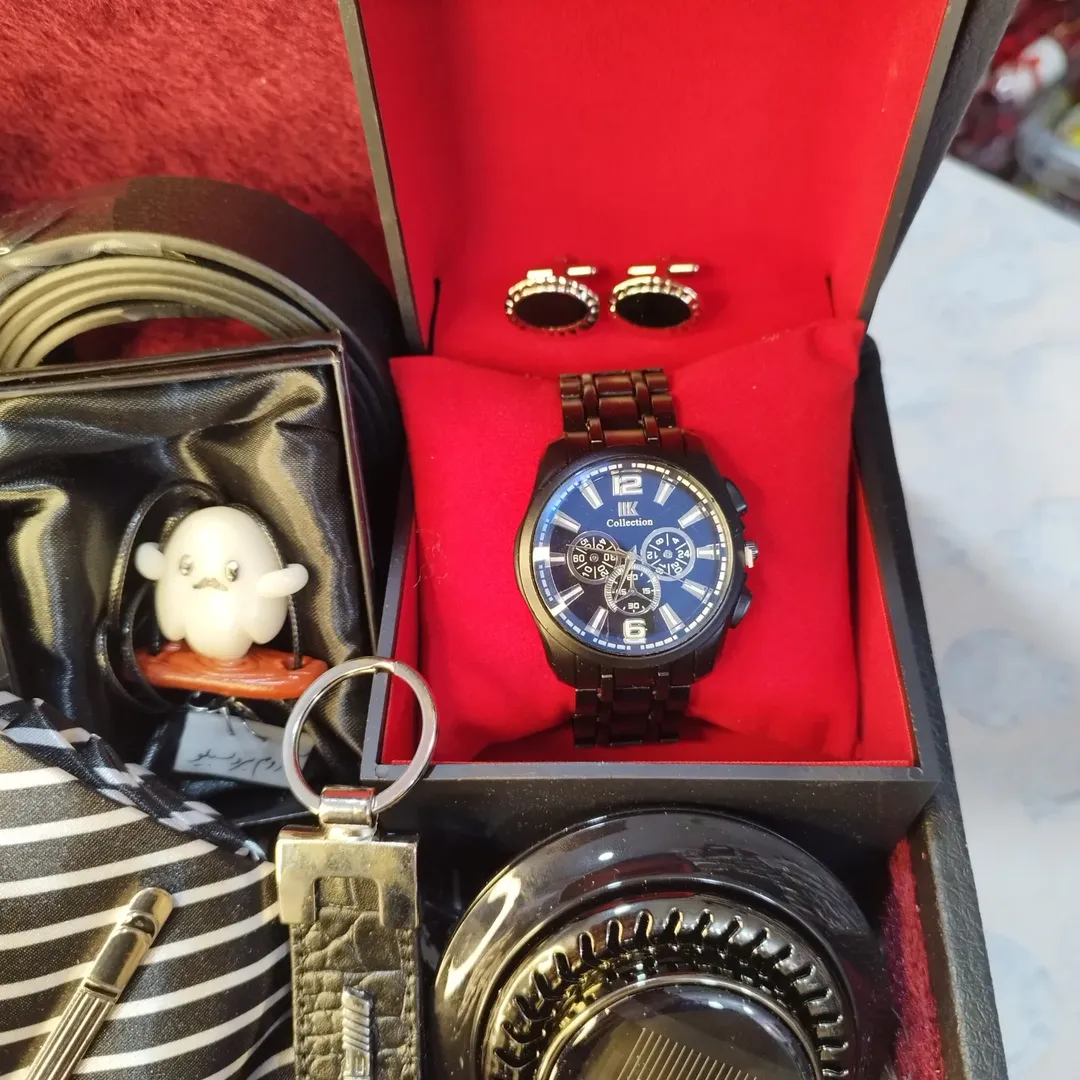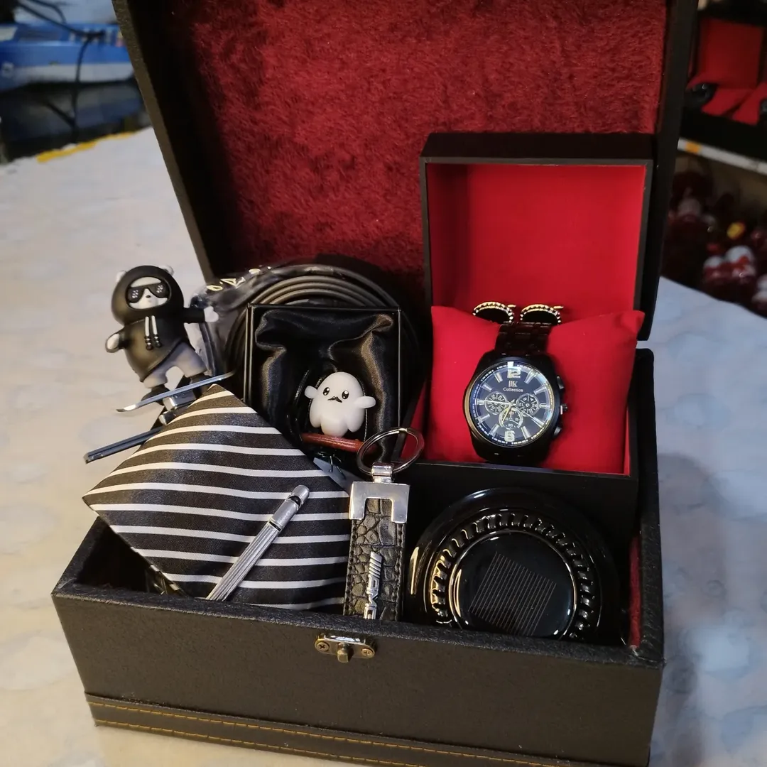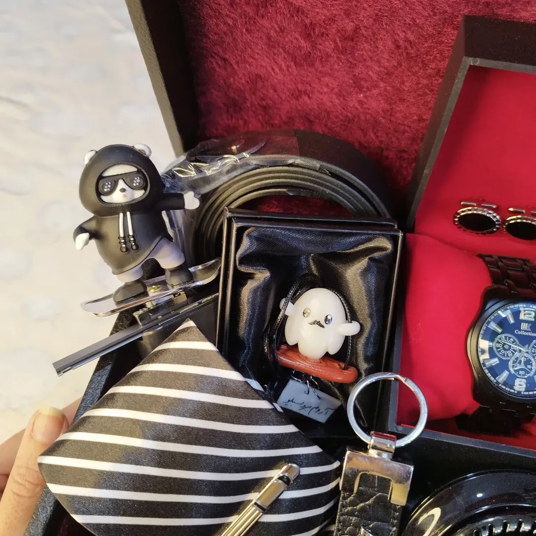 این باکس مجموعه ای هس از کارایی ک جدید آوردیم خوشبو کننده خورشیدی ماشین ،ست کراوات ، دکمه سرآستین، کمربند، آویز ماشین، جاسویچی، گجت خرس اسکیت سوار ساعت مچی جعبه چرمی داخل مخمل.